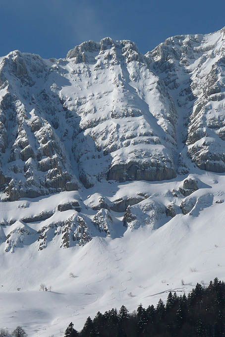 Montée par des pistes forestières : approche impecc et très skiant au retour. Couloir septentrional : ressaut à 50° au départ avec cailloux affleurants et idem à la sortie (un peu de gratonnage à la descente). Tout passe à skis. couloir méridional : RAS, un poil + raide mais pas de ressauts et sortie en haut à vaches. Chaque couloir peut être comparé en difficulté à la face est de Pierre Blanche. 250 m de haut pour chacun d'entre eux.