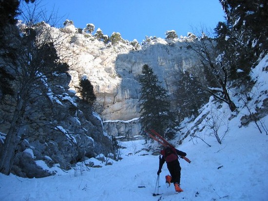 au vu de la qualité de neige dans la combe du PRAYET, nous avons préféré faire le retour en boucle. la traversée du CAHOS de BELLEFOND reste un exercice délicat voire dangereux (comblement neigeux de certains gouffres). il parait plus judicieux du sommet de rejoindre le pas de ROCHEPLANE en descendant l'arrête nord puis vers 1800m continuer à droite sous le PAS de MONBRUN et le PITON de BELLEFOND pour rejoindre la cabane.