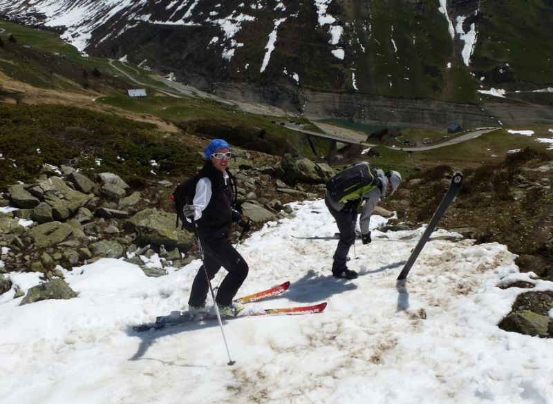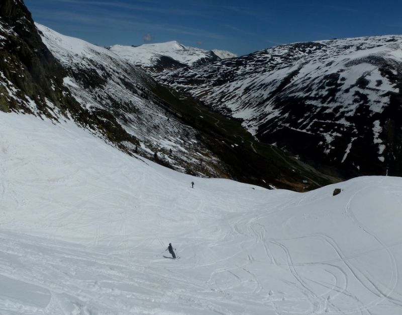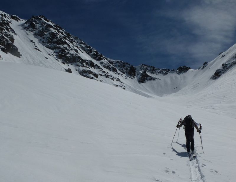 Rocher blanc par le sud, tentative dans le couloir en banane, demi tour après une centaine de mètres (neige croutée quasi inskiable). Retour au sommet et descente versant nord excellente puis retour par le col de l'amiante qu'on shunte pour un petit passage légèrement au sud qui donne accès à une combe parallèle à la voie normale sud qu'on rejoint vers 2500.