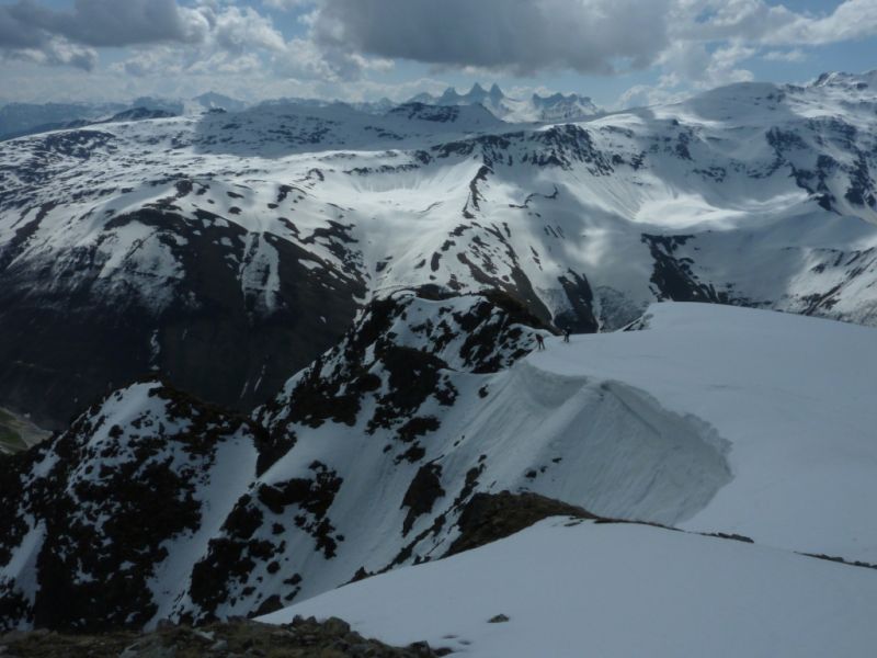 I9 en ar puis remontée au Pilliozan par I11 puis entrée dans un petit couloir orienté sud par I12.1. En bas de celui-ci on a tiré à gauche pour trouver l'entrée du couloir le plus à l'est du Pilliozan. En haut de celui-ci quelques pas de désescalade nécessaires avant de prendre pied sur la neige. Un couloir bien moins raide (cotation 4.3?) que ses voisins mais aussi long. Une bonne petite trouvaille (en même temps on le voit en premier de la route). Sinon énorme corniche en haut du couloir de droite qui se passe par un des côtés.