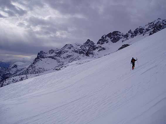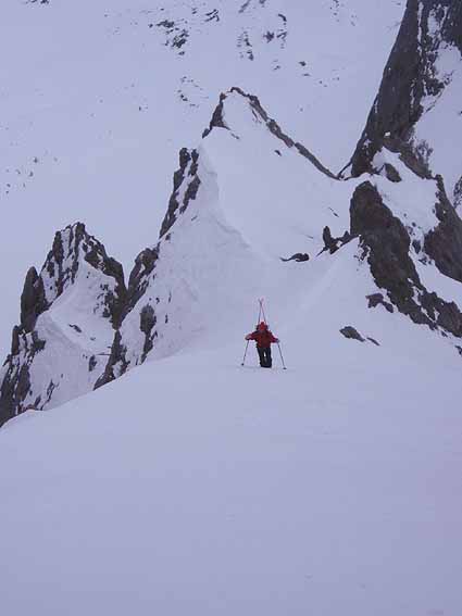 L'objectif initial a été modifié en cours de route. D'abord, la traversée par le couloir nord du Bouchard : celui-ci était, dans sa partie supérieure, décapé par les vents de nord. Nous avons fait l'aller-retour donc par le sud. Ensuite, la croix d'Aquila : mauvaise conditions aussi dans le couloir nord direct avec une neige travaillée et de belles plaques à la base. Nous nous en sommes donc tenu à la traversée classique.