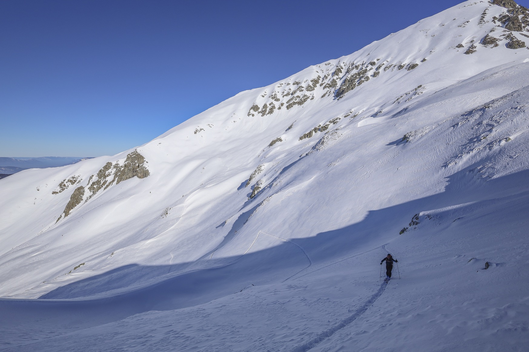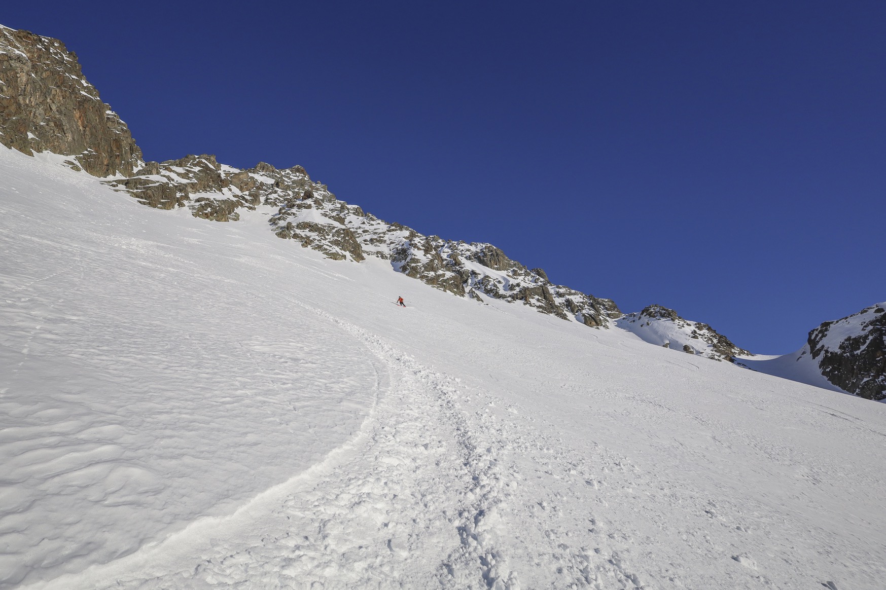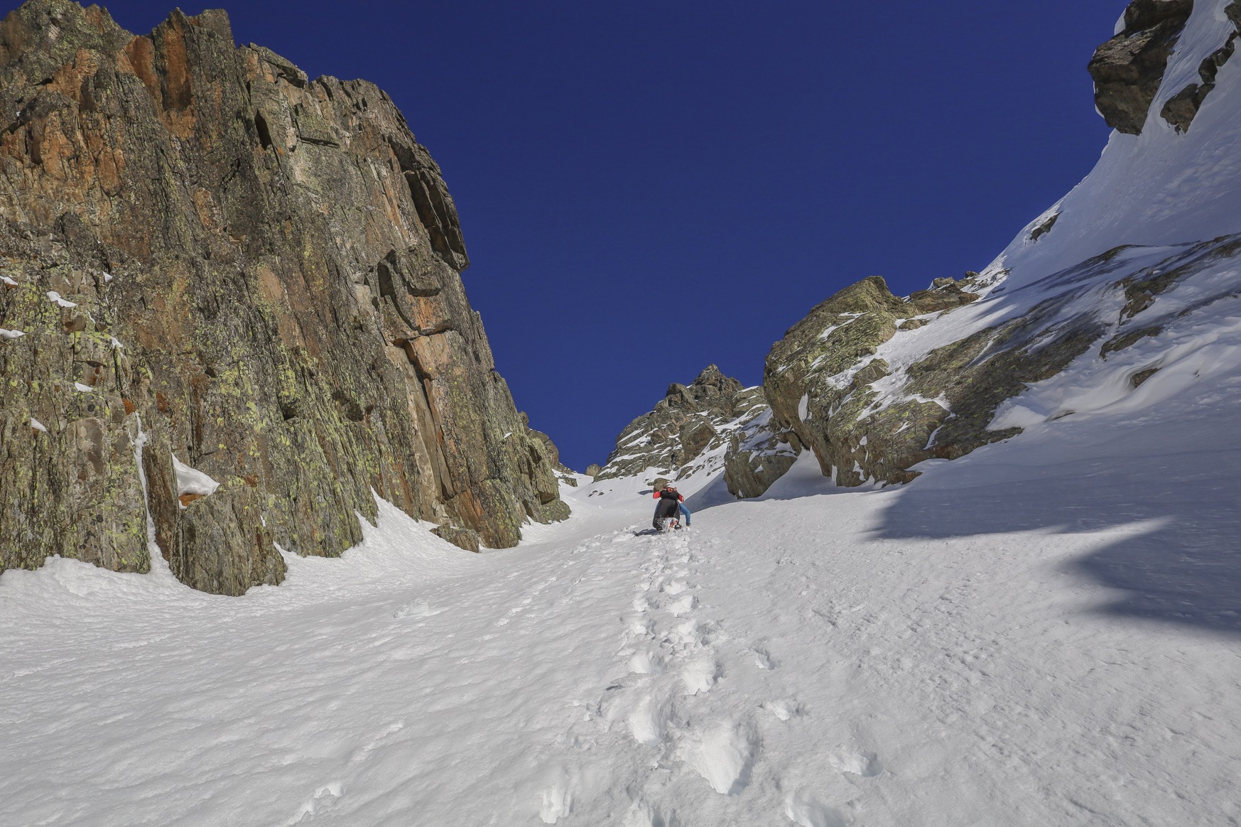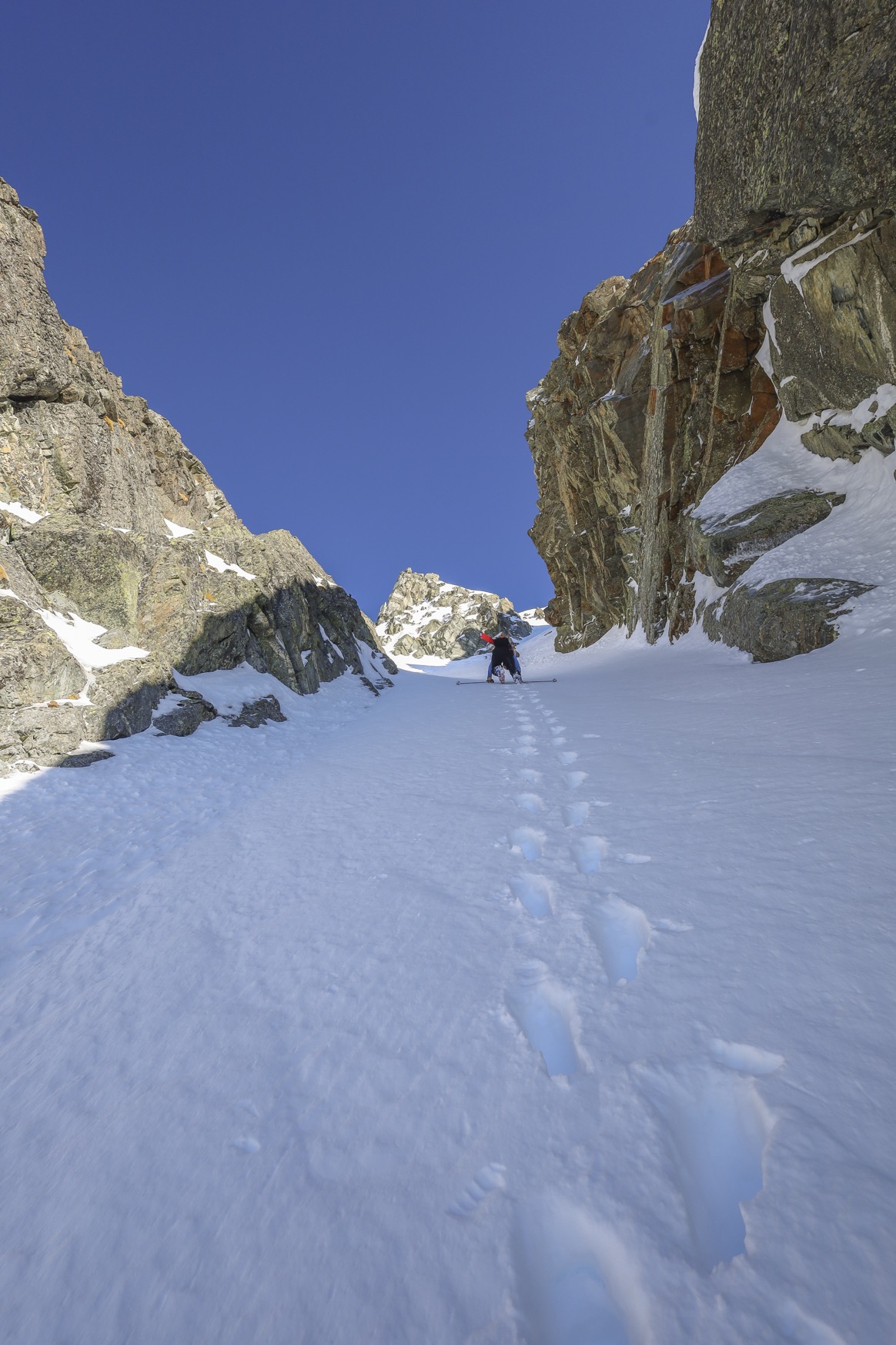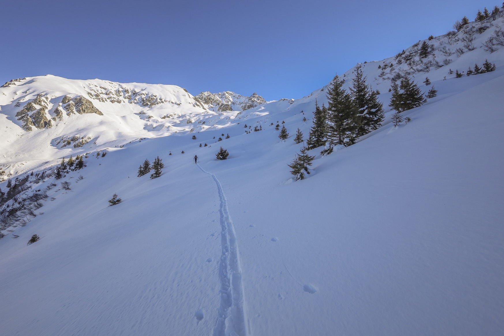Partis sur l'idée d'un full traçage, on déchante au pied du couloir voyant deux skieurs le descendre à vue puis poursuivant dans la gorge. Pas grave, on opte pour la variante de gauche. De + en + difficile de faire la première trace du parking au sommet puis idem dans l'autre sens, surtout en Belledonne 5 jours après une chute de neige et sur 1800 m de D+ alors, on ne fera pas la fine bouche d'avoir loupé le couloir principal, déjà connu de nous deux, pour répondre à ce cahier des charges.