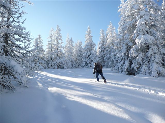 En forêt nous avons suivi un chemin avec des marques rouges fluo peintes assez hautes sur les arbres, une trace de raquettes à bien facilité la longue traversée vers le sud.