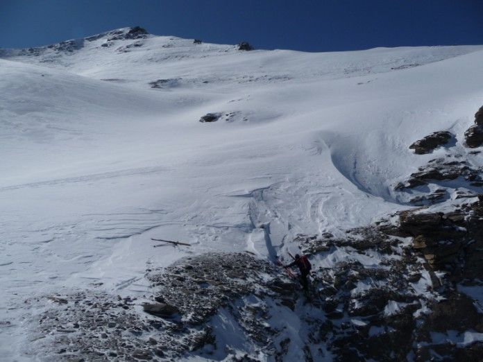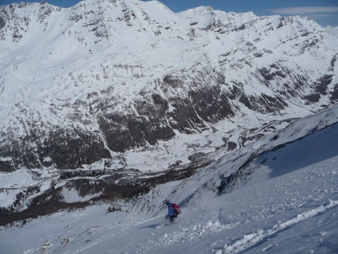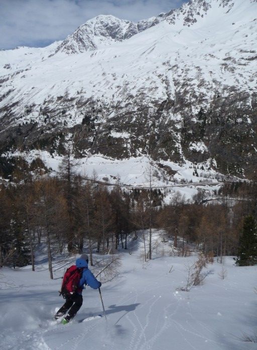 Sur la croupe en rive gauche du ruisseau de l'Arseis, on s'est posé des questions : on passe de neige bétonnée par le vent à 50 cm de poudre dense, vu la configuration de la pente, on a pas rigolé.