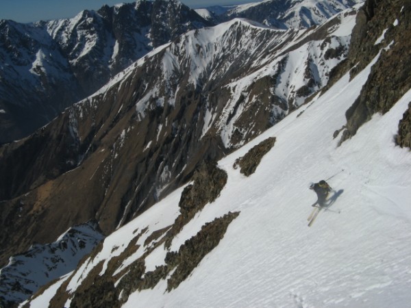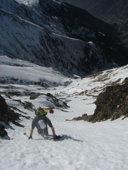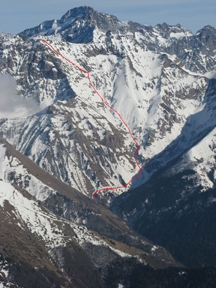 Repéré l'avant-veille depuis la Rosière, LAL n'ayant pu se joindre à nous. Au départ, mauvaise surprise, la route après le P 1001 est en glace, on essaye en voiture mais en vain (une autre essayera après nous mais finira 200m plus bas au fond du ravin ; les passagers ayant eu le temps de sauter ! pire qu'une LALerie...). Quelle satisfaction au sommet de poser son cairn sur ce sommet méconnu. Pour les constipés des approches, passez votre chemin ; pour les fans d'air pur saveur Ecrins sauvage, allez-y ! Grosso modo 1000m de pente à 40° en moyenne avec pass à 45 cot 4.3/E3