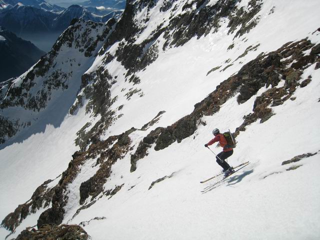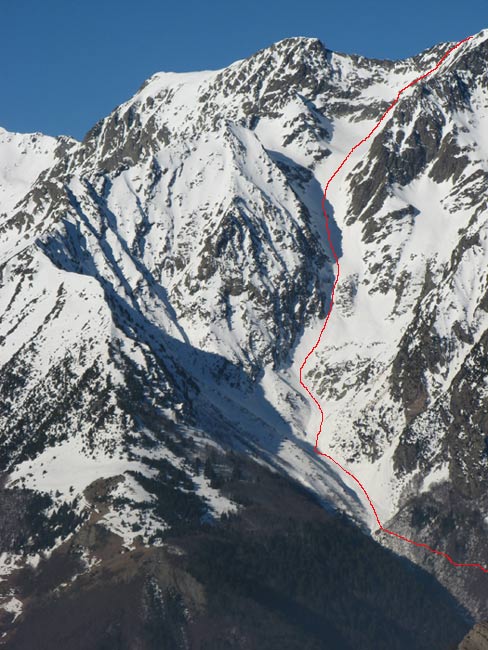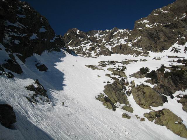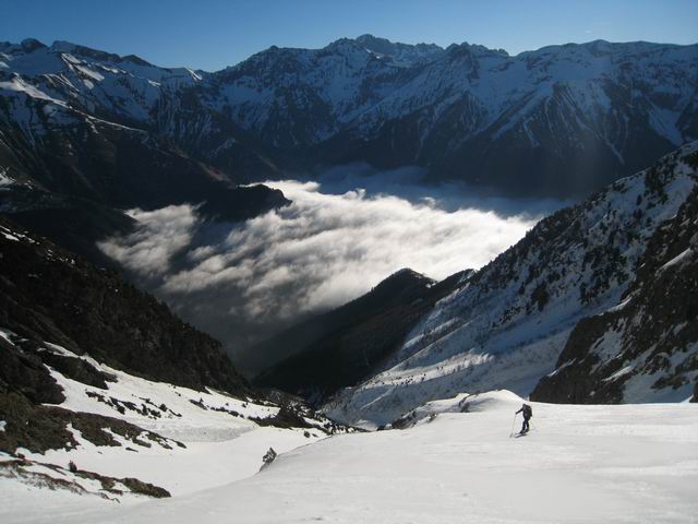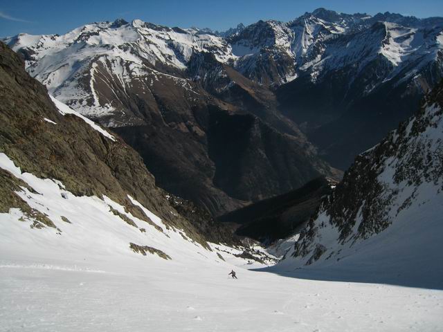 Encore un initéraire sauvage dans un cadre magnifique grâce à un repérage soigné de Manu [8 jours plus tôt->http://www.volopress.net/volo/sortie2788.html]. Certes il a fallu composer avec les 500m de portage, mais la piste forestière est excellente, ça pinaille pas. Ni dans la combe de Cros où la pente est régulière à 30°, avec un final plus raide dans le petit couloir de presque 200m.
