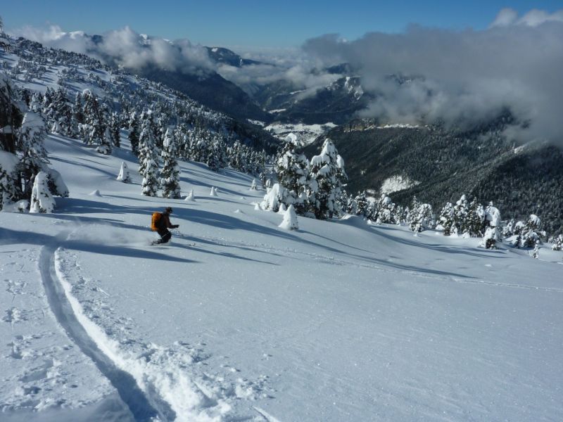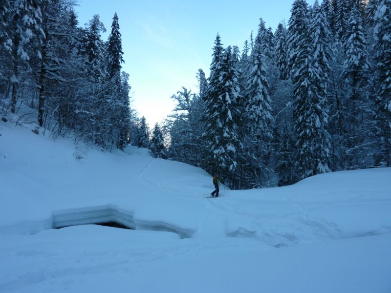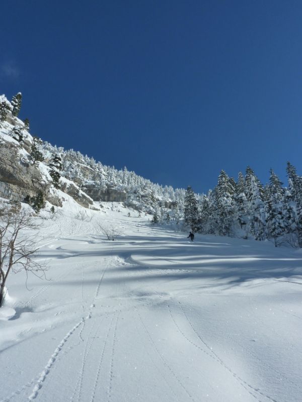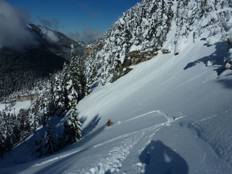 Une belle poudre bien stable tout le long. Au retour ça avait déjà bien chauffé sous 1200 pour donner une neige collante. Des petites purges des falaises sans conséquence.