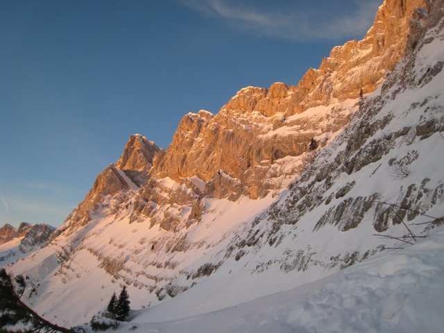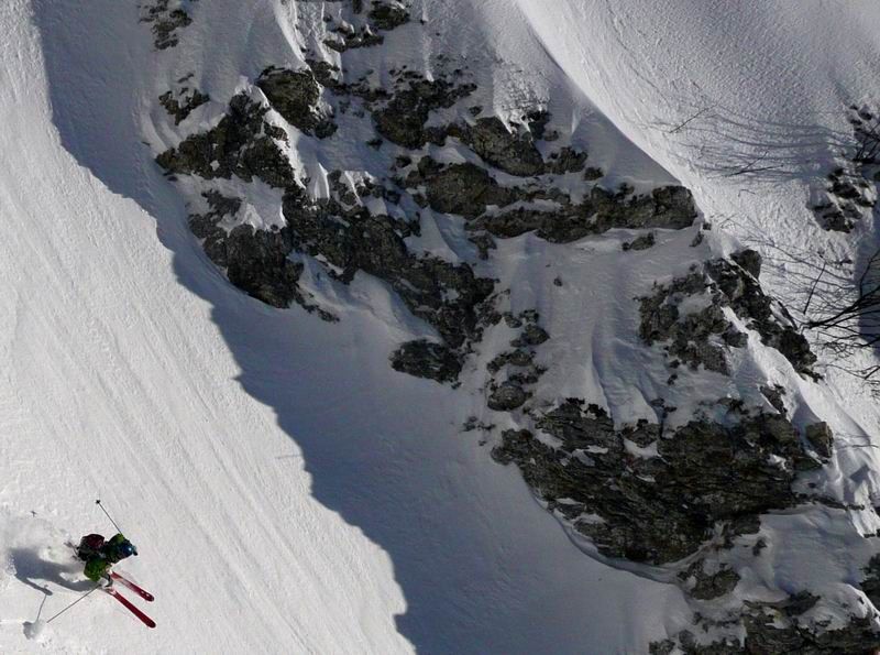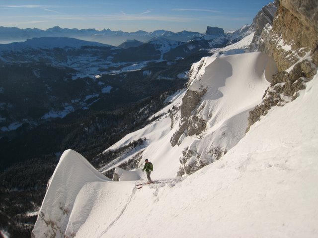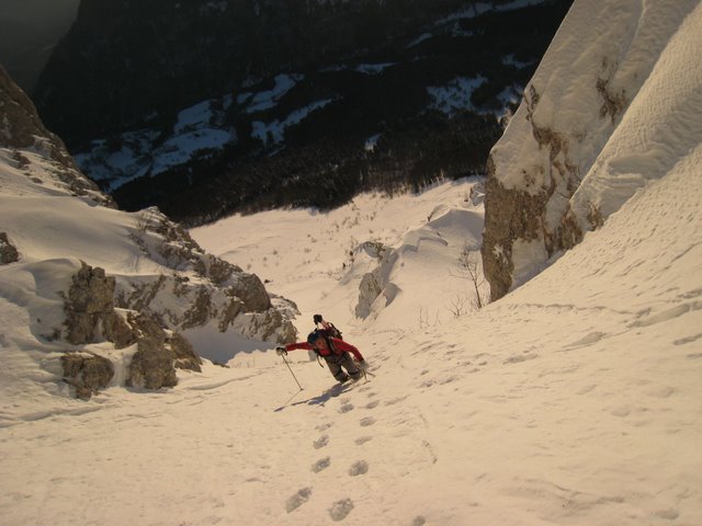 La couche de neige fraiche a encore pas mal de cohesion , c'est mieux qu'hier mais j'ai eu droit a un bon départ de plaque sous les skis... Pas super gros (ça descend qd meme jusqu'à la foret), mais de quoi sauter la petite barre sous le couloir. Les pentes d'accès présentent également des accu douteuses , évitées à la montée comme à la descente. Le couloir nécessite un tout droit , ou un peu d'accrobranche!