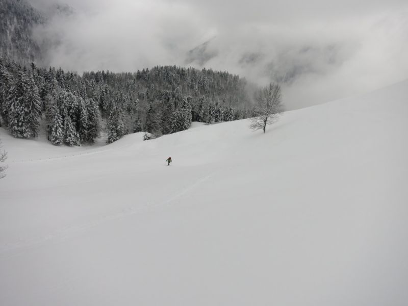 40 cm de neige fraiche d'hier du haut en bas qui s'humidifie plus ou moins suivant les expositions, pour le couloir , le couloir chauffe et il y avait une neige dense posée par endroits sur de la dure( des petits départs qui attisent la méfiance et le questionnement ...)
