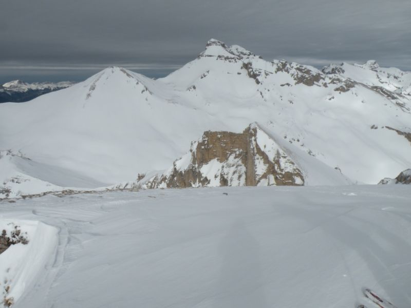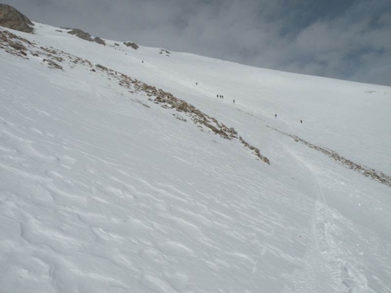 La montée par G5 se déroule sur une neige poudreuse roulée par endroit, mais la sous couche a l'air bien stable. La descente par G4 prend bien le soleil, la neige s'alourdit mais pour le moment pas de création de boules.