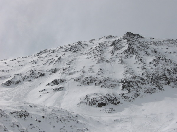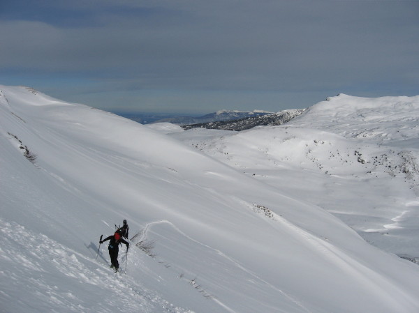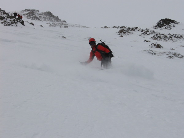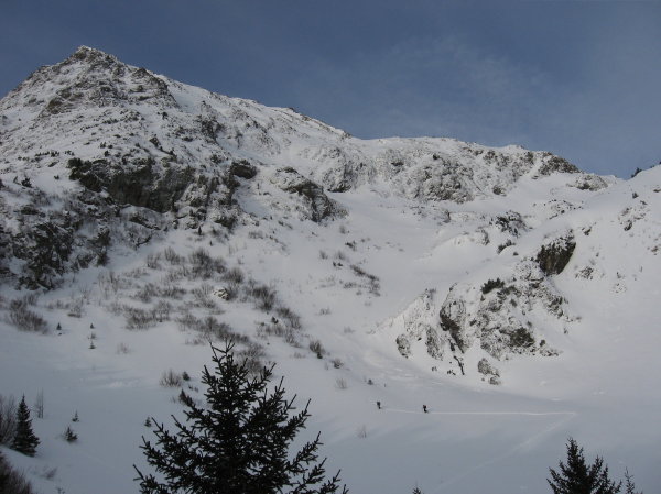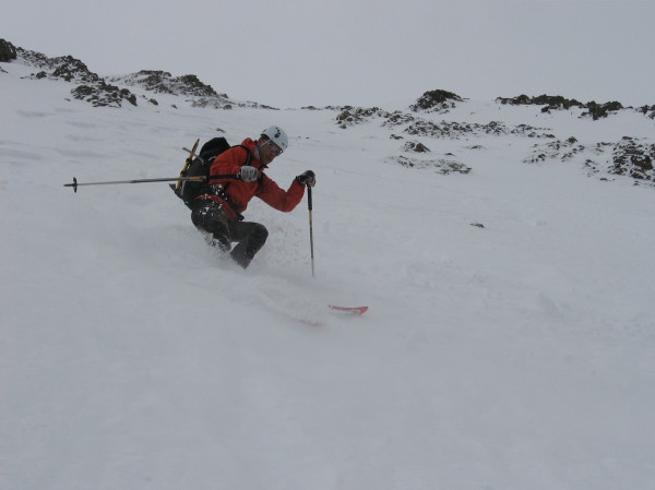 Gros travail du vent au niveau du replat de la jasse avec zones de dépot plutôt orientées E. Dans la face présence de plaque friable dans les zones ouvertes à l'est. En bas de la face j'ai fait partir une petite plaque dans une contre pente justement orientée plus Est. Sinon en restant dans les goulets orientés plus N on a des conditions saines : poudre assez légère sur fond crouté dur mais pas glacé (sauf dans le bas de la face,dans une zone nettoyée par une purge) ou en grain fin. Bonne accroche entre les couches mais la neige glisse en purges ponctuelles entre 2 virages.