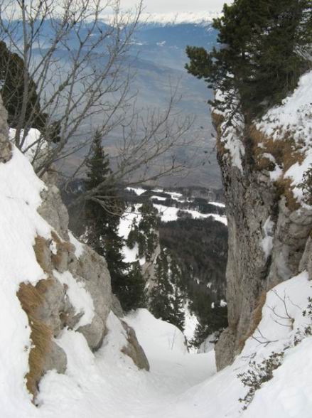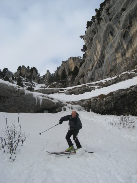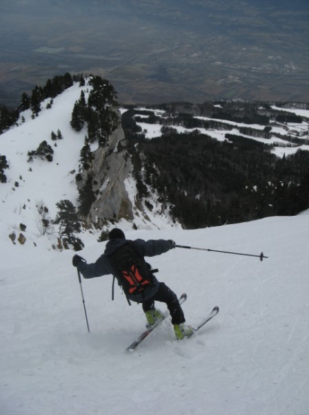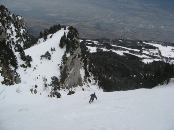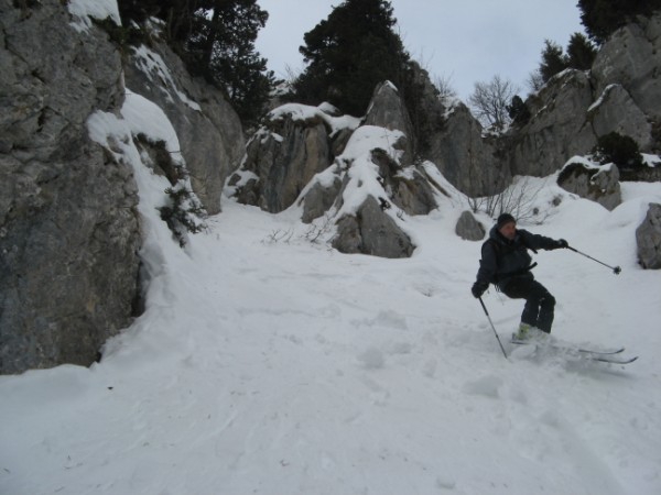 Après les dernières chutes de neige remontant à 15j, faire sa trace en Chartreuse dans un coin sauvage est un vrai bonheur !!! (Pourtant bien visible du Grésivaudan !). Le couloir est technique en haut, raide et étroit, puis très esthétique en dessous avec une belle falaise qui la borde. La Chartreuse n'a pas finie de nous étonner...