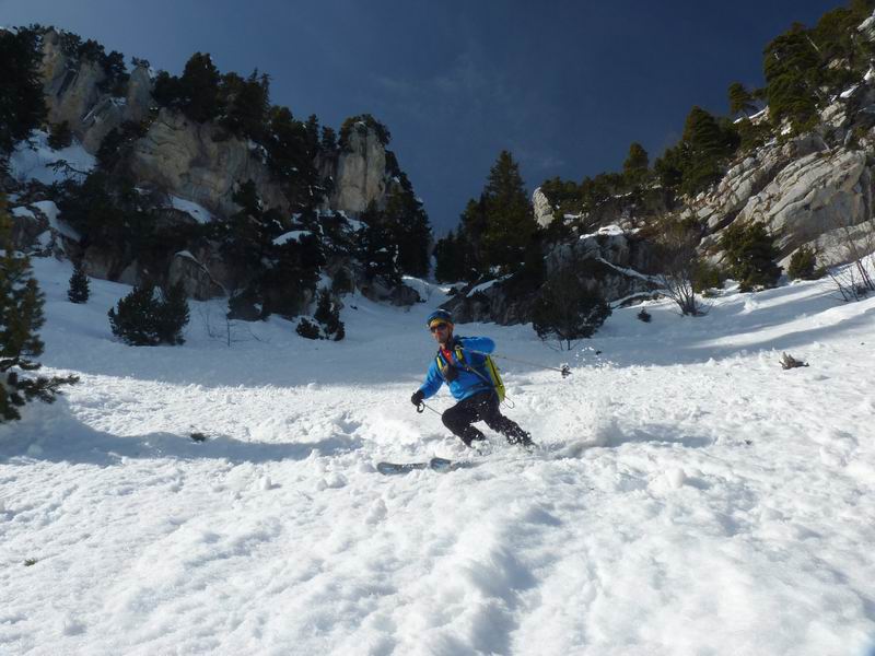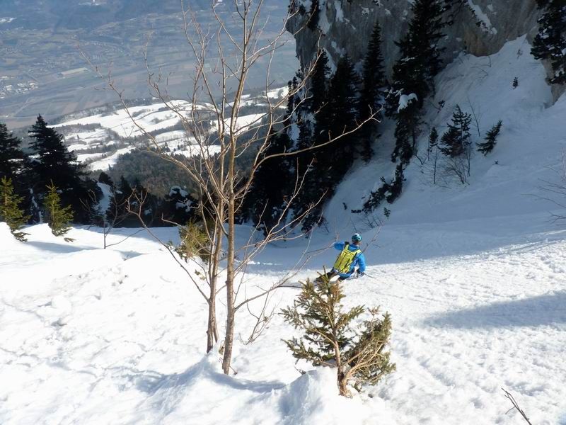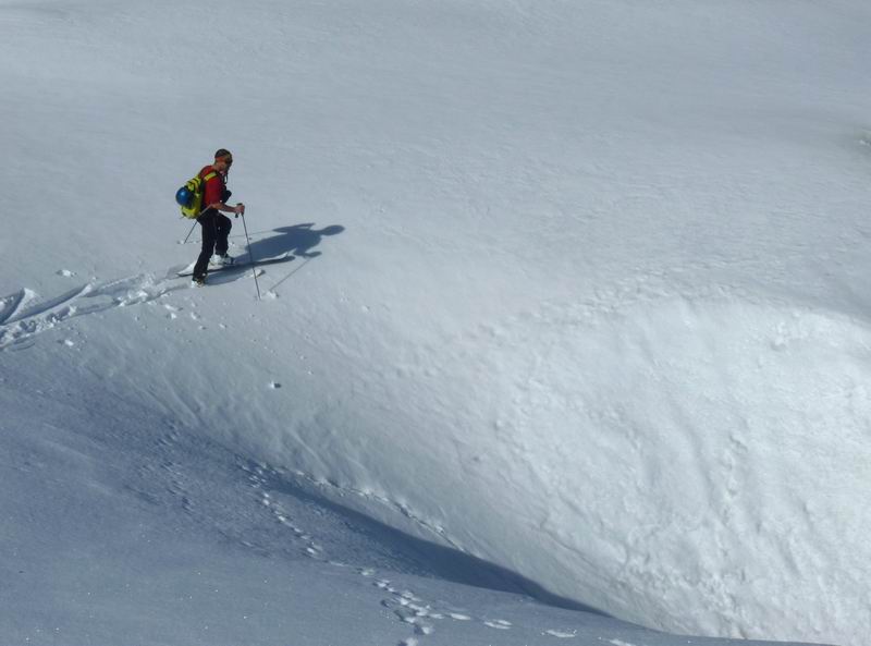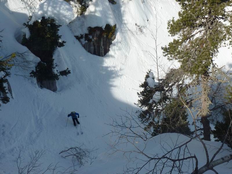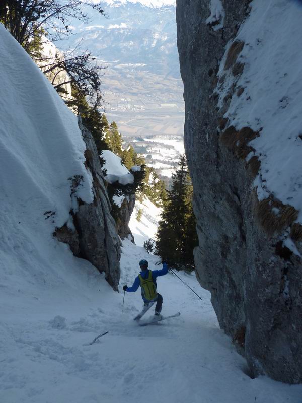 Couloir déjà emprunté par [une équipe de foot->http://lesbertonches.over-blog.com/article-25995768.html]; il semble que nous ayons utilisé hier une autre entrée que la leur après avoir pas mal hésité entre les 2. Ca passe au prix d'un déchaussage de 15m pour passer un ressaut en neige dure, 50m sous la crête. C'est trop raide et étroit pour supporter le label MLF approved, c'est tout dire !