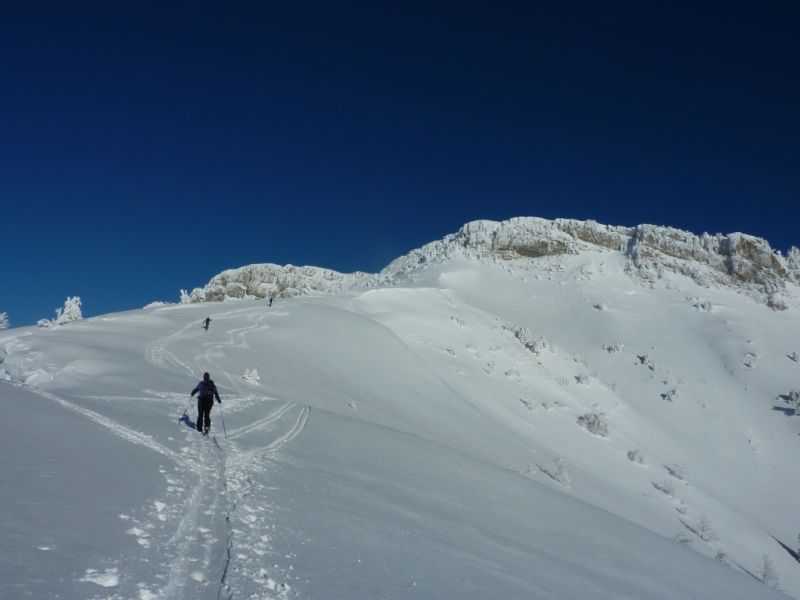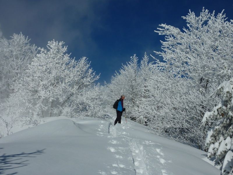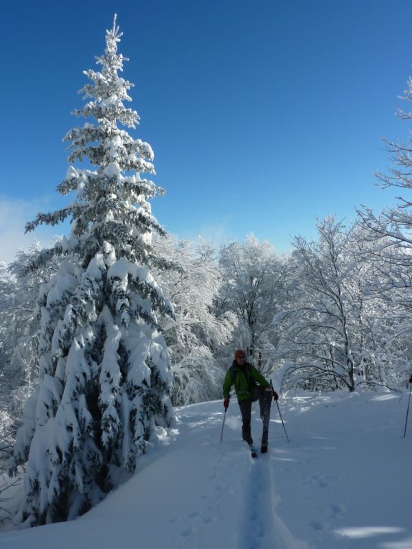 Que de contrastes : montés dans le brouillard et dans une ambiance ouatée, un peu avant la sortie de la forêt, le ciel d'un bleu presque marine se découvre. Au col des Bannettes, le vent du nord nous accueille sans ménagement. A la descente dans la forêt très bien enneigée, on pouvait skier sans craindre une branche ou une racine traîtresse. Montée tracée avant nous.