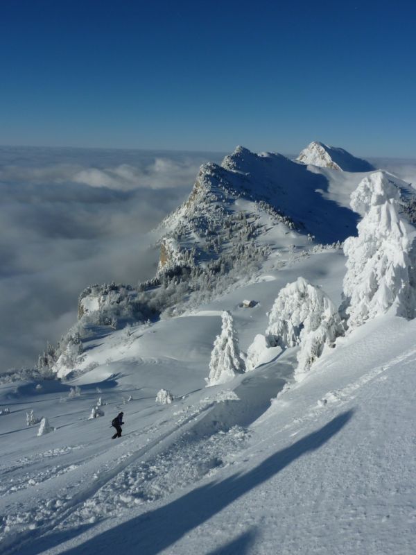 La quantité de neige au départ, 800m seulement, est comme partout assez impressionnante. 100m plus haut sur le replat on a mesuré près de 60cm. Cependant à cette altitude elle est assez dense mais bien protégée du vent dans la forêt. Au col des Bannettes, le vent tempétueux de nord s'il continue ainsi finira par décaper la croupe. Cette après-midi, elle était tout à fait correcte à skier.