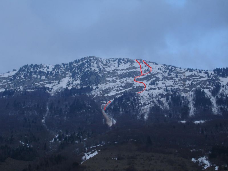 Le Molard - montée plein ouest dans le talweg, puis la face. Sortie 40m sous le sommet, sur la crête, pour cause de timing trop limite.