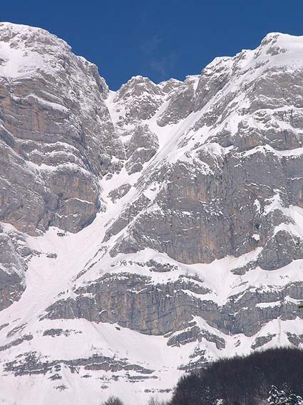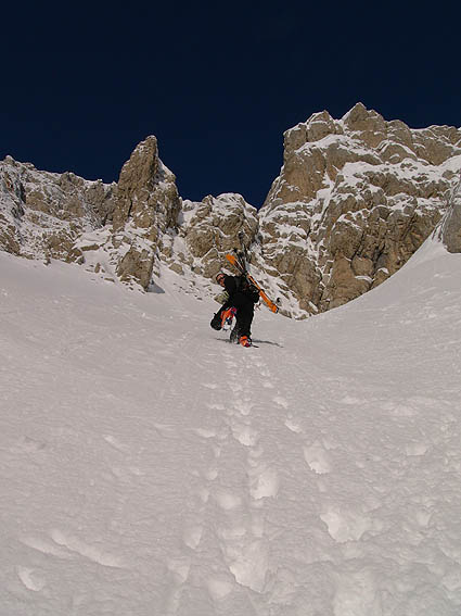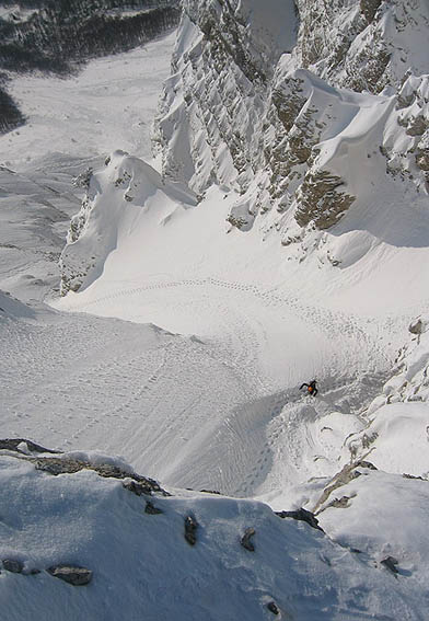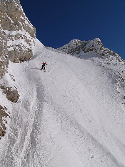 le goulot a bien purgé hier et peut-être aussi jeudi. Le passage clef est déjà dégarni (coulée sur les dalles), reste une bande de 5m le long des rochers où ça passe skis aux pieds. C'est le problème de la course car ce passage se purge systématiquement (très raide sur dalles de rocher) au premier jour de beau. Quant à y aller avant......... Sinon, question qualité de neige, un peu de tout dans la face où l'on trouve des orientations est voire nord-est à sud. Un peu de poudre, un peu de poudre réchauffée, de la poudre transfo, de la croûte de regel. La transformation des parties les plus chaudes n'est plus loin (demain ?). La moitié inférieure est abîmée par la coulée issue de la dalle dégarnie mais ce n'est pas très raide et il est toujours possible de traverser à droite ou à gauche vers une zone bien skiable.