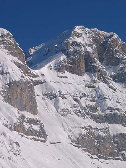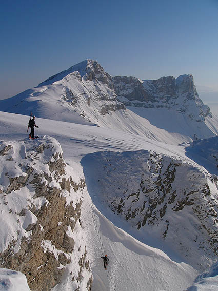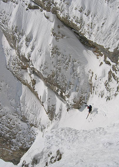 Il fallait bien skier un jour cette ligne évidente et c'était à priori le jour à saisir même si il y avait certainement des centaines de mètres de déniv à faire en grosse poudre ailleurs aujourd'hui. Les conditions excellentes (il nous semble difficile d'avoir mieux) de remplissage ne sont pas pour autant garantes d'un ski facile, notamment en raison des dalles 100m sous le sommet déjà bien dégarnies. Sinon, c'est un très bel itinéraire dont le charme vient à la fois de la grande pente du haut mais aussi du couloir coudé "dérobé" qui permet de sortir dans l'axe et d'éviter une exposition style Grande Moucherolle. D'ailleurs, en ce qui concerne K4, l'enneigement y est exceptionnel avec la barre du bas quasi toute comblée et celle du haut disparue !