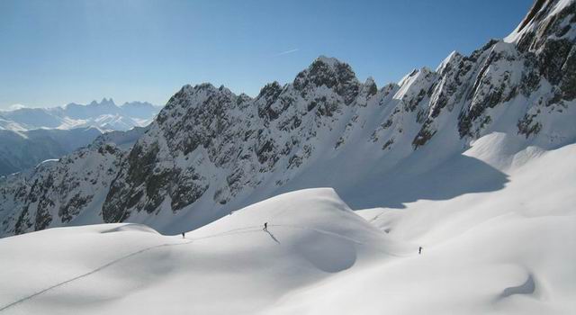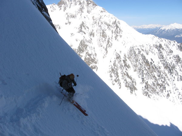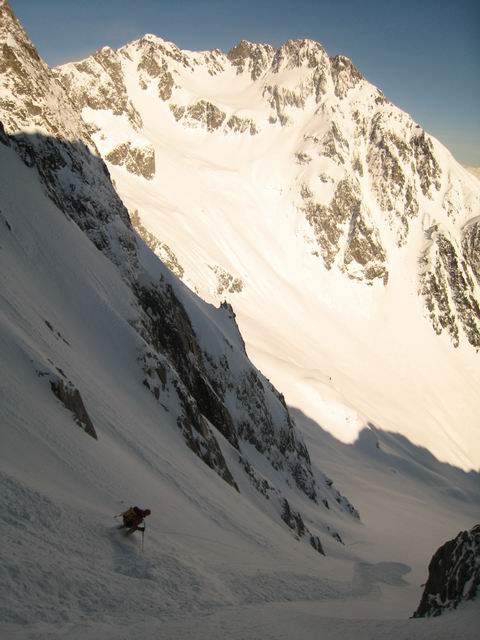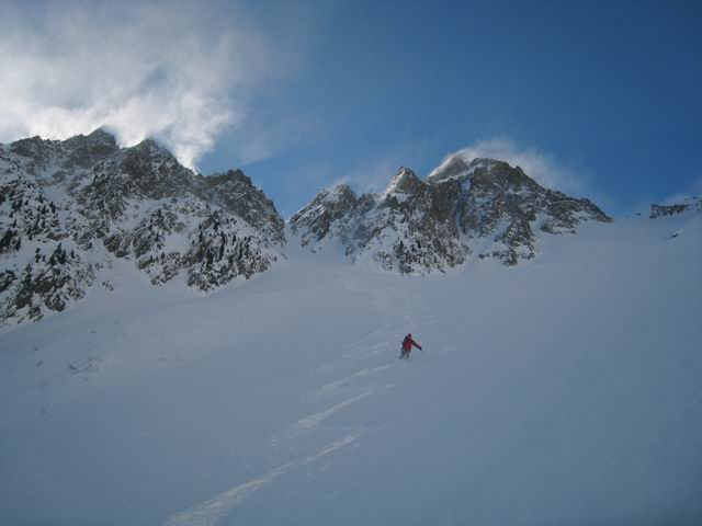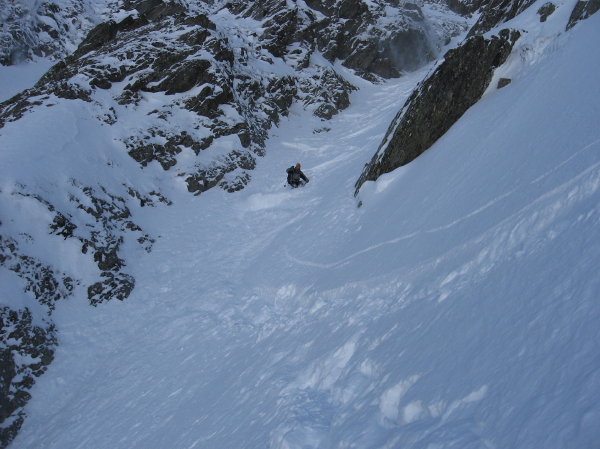 Couloir Central: brasse coulée pour le remonter=> des accumulations jusqu'à 1m dans la partie basse, avec de la poudre sans cohésion. Partie supérieure (les 150m raides au dessus du ressaut rocheux, évitable par une écharpe neigeuse en RG) avec des quantités moindres (40-50cm)mais plutot denses: plaque friable avec bonne accroche avec le fond dur voire un peu glacé tout en haut. Toutefois il faut être vigilant (petit déclenchement sans gravité entre 2 virages)