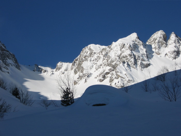 Le vent du jour se renforçant en journée commence à travailler la neige en surface (traces de montées effacées). Départ commun puis retrouvailles dans le vallon de la pierre avec Lio et Jo. Mention spéciale pour Manu qui ayant oublié ses peaux a tout fait à pied (heureusement que le fond dur n'était pas loin...)