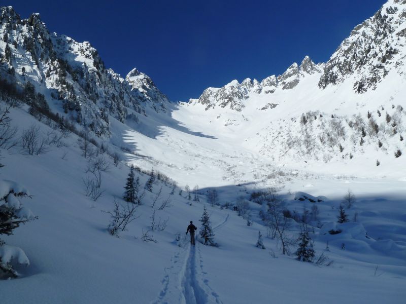 ras. ça déchausse à la voiture moyennant quelques courtes interruptions (ski sur feuilles mortes). Trace à faire à partir de la bifurcation avec la combe de la Valette, puis combe déserte. Le remplissage du couloir n'est pas encore optimal, avons passé le ressaut en crampons (poudre sans adhérence sur rocher) à la montée et l'avons contourné en rive gauche à la descente.