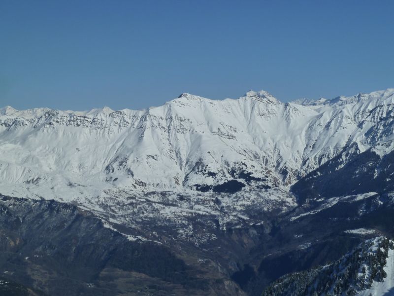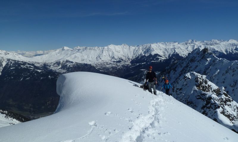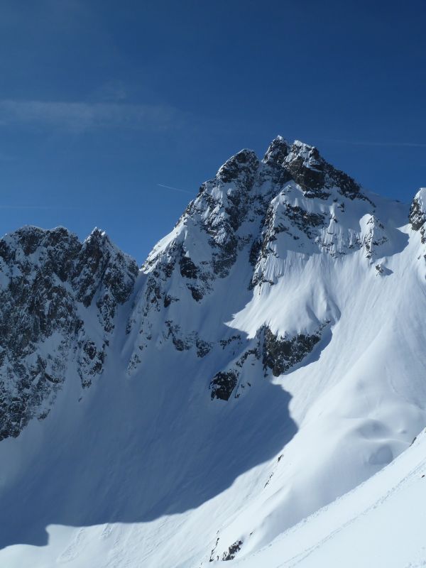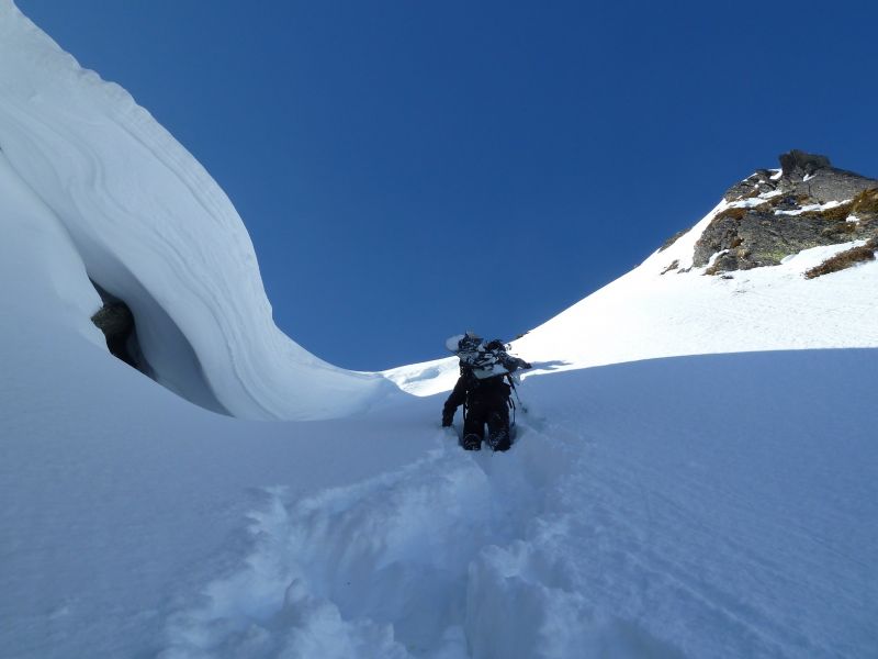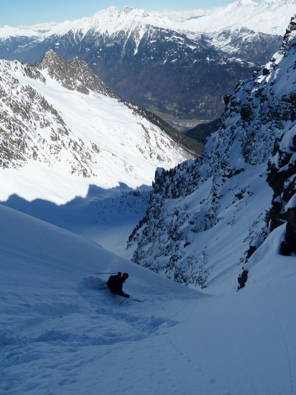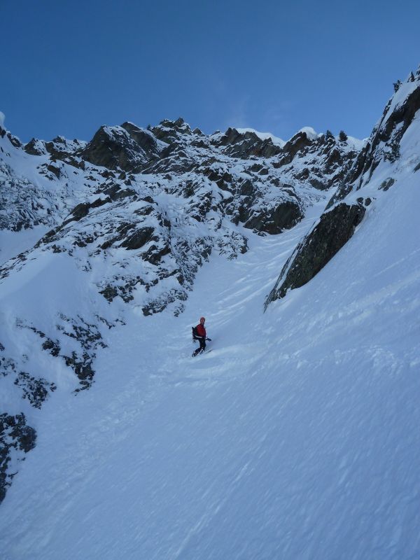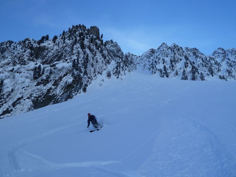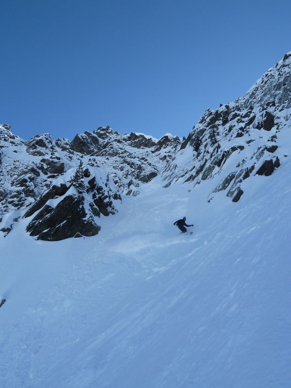 Joli couloir, beau temps, Belledonne plâtrée, et partage de cette descente avec deux "split-snowboarders" sympas rencontrés dans la combe, avec le même objectif que nous. Les crampons crissent un peu pour franchir le ressaut, mais à la descente le contournement est facile et skiant. Puis ça déroule à grande vitesse dans une poudre à ne plus savoir qu'en faire...