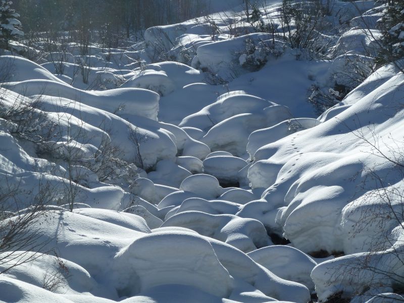 l'ensemble semble sain avec une adhérence correcte entre les couches, mais par endroit on observe une bonne quantité de neige roulée dans la dernière couche, donc gaffe à la prochaine chute. Grosse humidification en versants ensoleillés avec la douceur, nombreuses purges observées
