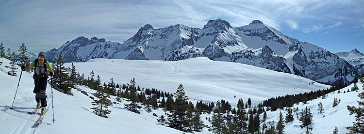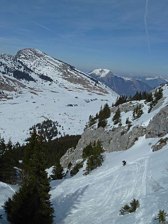 Neige excellente à skier en versant sud-ouest des rochers de Leschaux où on a testé une petite variante un peu plus directe (ça passe mais pas forcément de partout)