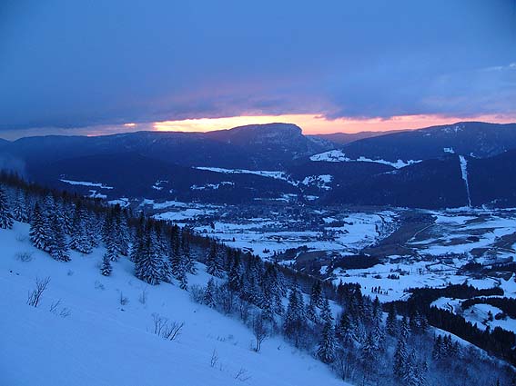 Parti tard dans l'espoir de bénéficier d'un beau coucher de soleil, c'était plutôt raté avec l'arrivée de quelques averses de neige et des bancs de brouillard. Heureusement, ce fut du très bon ski à la descente.