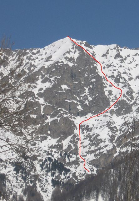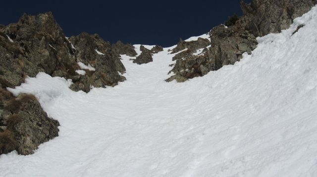 Voir photo. On suit G1 jusqu'aux sources de Prentiq.ON remonte un premier couloir qui vient buter sous une falaise, par un crochet à droite on prend pied dans le couloir sommital. 150m sous le sommet on a le choix de sortir direct à la crête ou comme ce jour de sortir par le couloir S du point 2497, bien raide (45-50°) et étroit (2-5m) sur 120m. Sinon c'est 40-45° sur 600m. Avec les purges qui ont ravagé l'axe j'ai surtout skié les contrepentes plus lisses mais plus raides. Cot 5.1? D+/D-:1200m