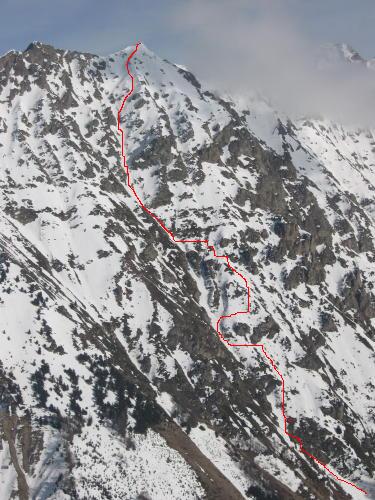 Voir photo: globalement c'est le ruisseau du secteur nommé prentiq sur IGN (les 2 alpes) avec un départ au point coté 1550 au niveau du GR et une arrivée au point coté 2497 en passant par le point 2058. IL faut un peu louvoyer dans les pentes en rive gauche du couloir pour shunter les passages trop étroits ou déneigés. Repérage d'en face conseillé. C'est une belle ligne de 950m de haut dont 700 m à un gros 40° de moyenne pour finir sur les 200 derniers m à 45°, la fin se couche pour sortir au dome sommital. Passages à 50° et skis sur rhodos obligatoires ce jour dans les zones déplumées. Cot 4.3+ /E3