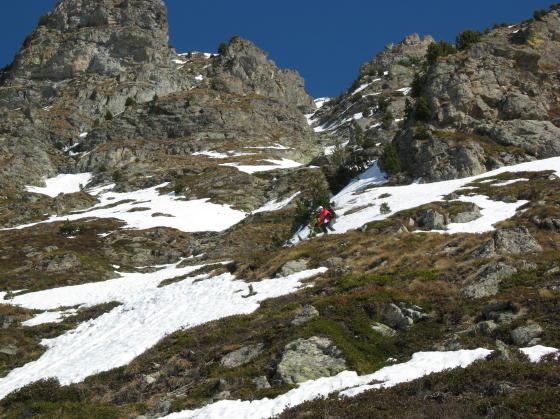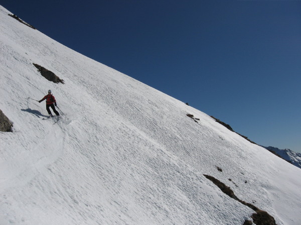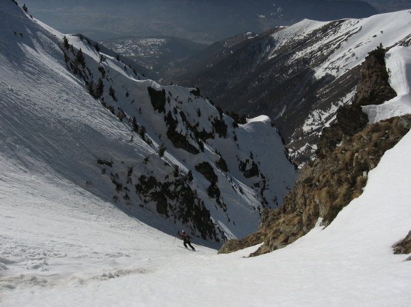 Dans le couloir, transfo avec quelques gros reliefs (vieilles coulées) dans l'axe ou contres pentes avec petits reliefs type début de pénitents. Branche terminale du couloir plus froide (200 derniers m) avec de la poudre en rive gauche type gobelets/faces planes sur 60 d'épais, pas très skiant ni trop rassurant quand on s'enfonce jusqu'aux rhodos...Départ à 13h00, un chouia tot ( un court passage encore à l'ombre et glacé) mais garantissant une neige encore portante, à peine décaillée mais avec du bon grip. Au retour après la partie de skating pour rejoindre le col de l'esparcelet on est descendu en rive droite sous le bois de la rima jusqu'au niveau du parking (portage horizontal de 2 min)