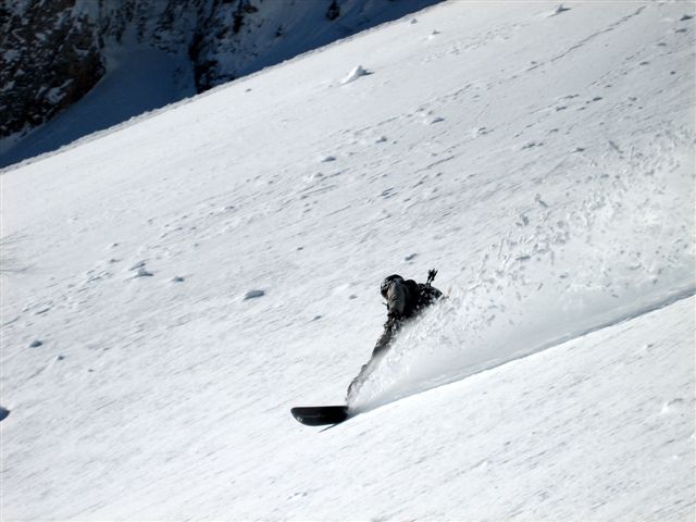 Après délibération, une fois de plus c'est l'option de Joël qui l'emporte. Magnifique balade, paysage fabuleux ! et une rencontre des plus sympatiques avec OLE et MLF, on aurait bien aimé converser plus longtemps, mais il nous fallait tracer rapidement pour essayer de rattraper le timing de LUD. Le couloir reste relativement bien à l'ombre, mais sa rive gauche chauffe vite.