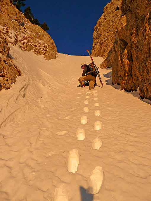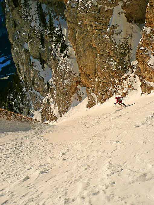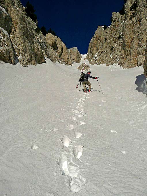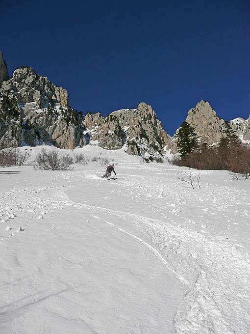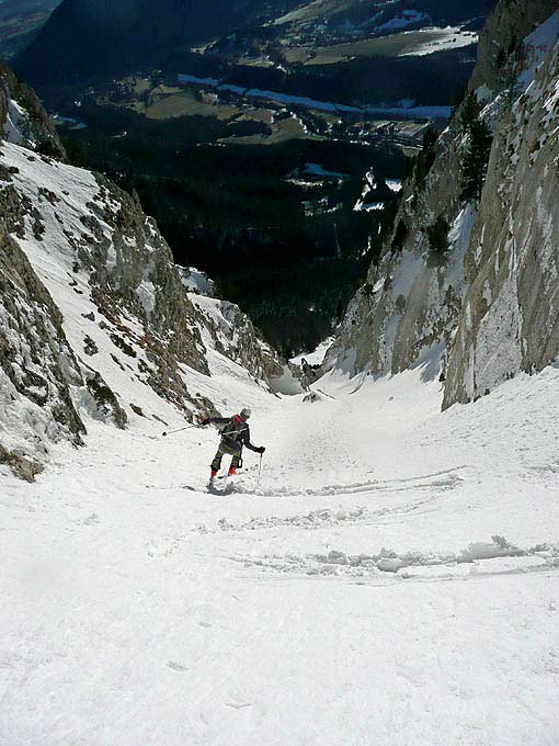 Empilement de deux couloirs insérés entre des parois rocheuses et se situant à proximité du pt coté 1931. Accès sans souci depuis la Richardière (forêt et pistes forestières très skiantes)