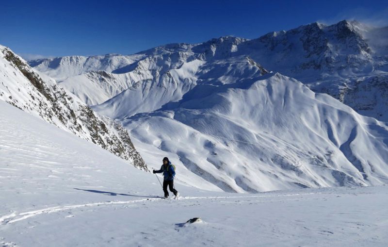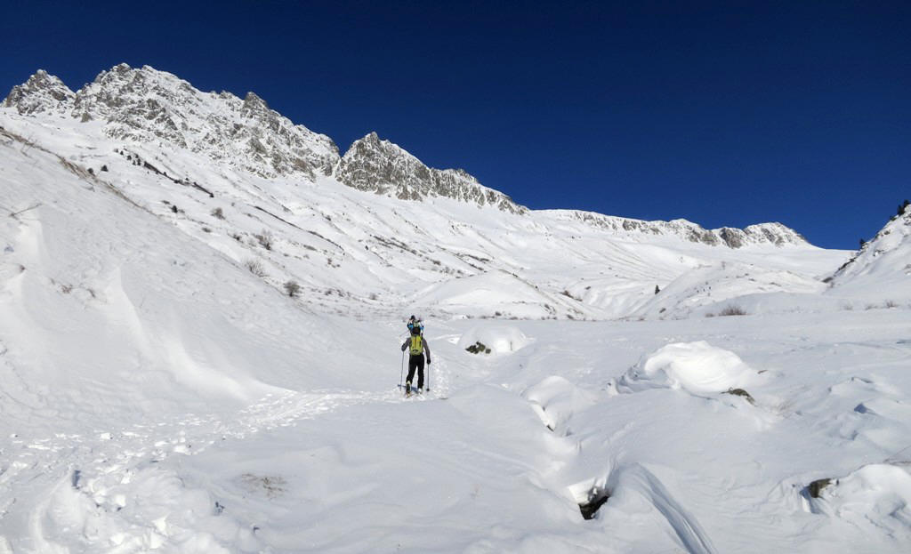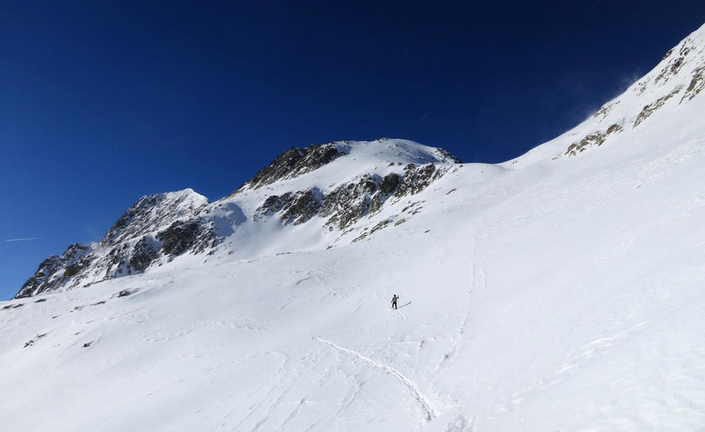 Montée classique F14.1 en évitant les zones d'accus, stop au collet au pied de la pente finale; descente et remontée au col puis la bosse, malgré le fort vent de nord en pleine tronche