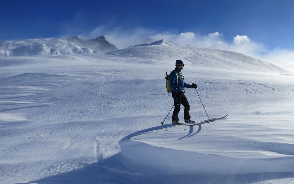 Gros travail du vent > 1600m, alternances de zones en poudre tassée, zones d'accus ; les traces de la veille sont presque invisibles. Quelques sections poudreuse, comme le haut de F14.1, mais globalement c'est du ski physique