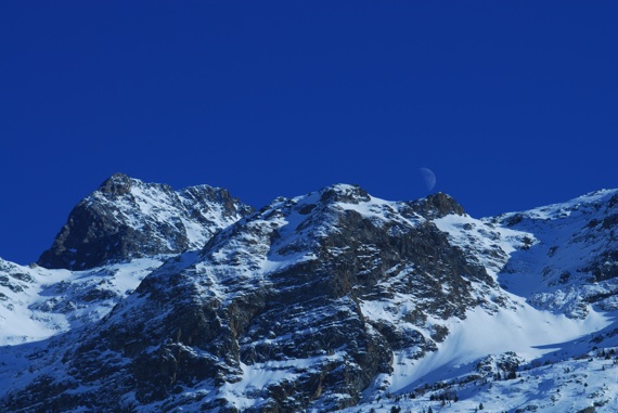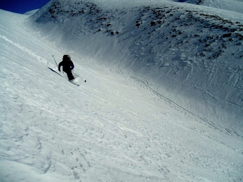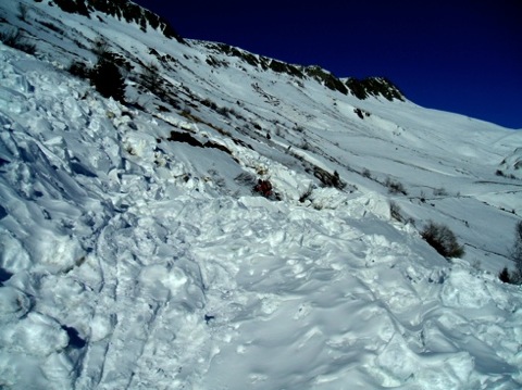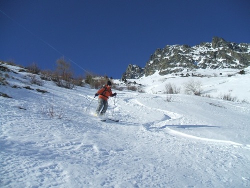 Le vent a soufflé et soufflait encore aujourd'hui dans le secteur. Il en résulte de grandes disparités de qualité du manteau: on passe, sur une même orientation, d'une neige dense et cartonnée à des neiges gelées et portantes (sous 2000m). En faces sud et est, la poudre est là, plus ou moins réchauffée, sur un fond dur. De grandes zones verglacées sont présentes sur les portions plates qui conduisent au col du sabot. De visu, la neige est meuble et facile à skier sur Côte Belle. Sous le Rissiou, au niveau de la combe de Cressin, quelques glissements conséquents sont partis, traversant la route.