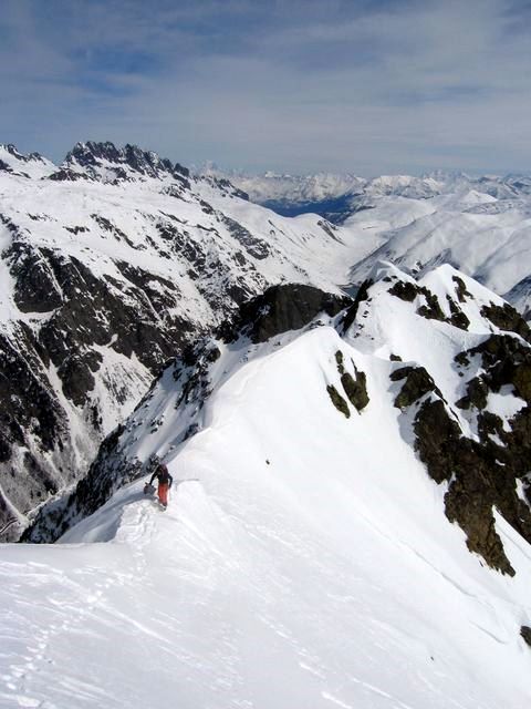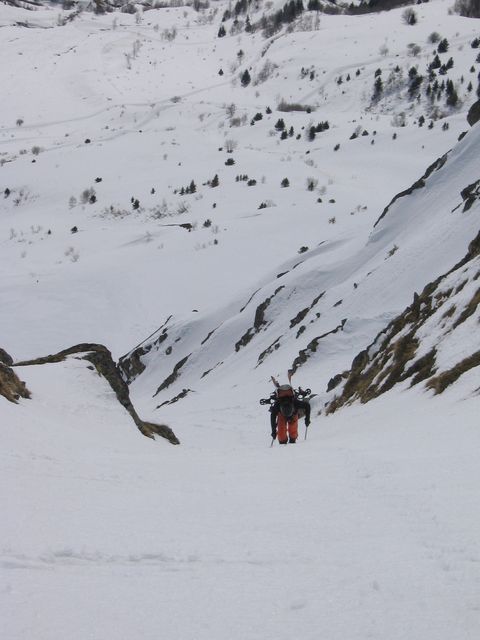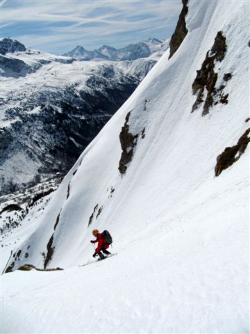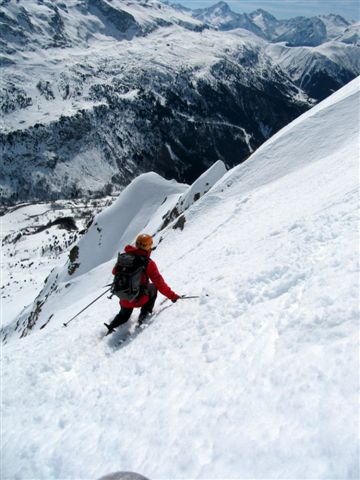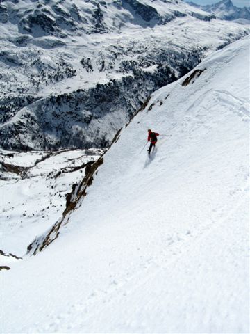 Rentrée grosso modo au milieu de la face par le goulet...puis au mieux en franchissant quelques ressauts plus raides entre les rochers jusqu'à l'arête. La face semble très bien remplie, il y a l'embarras du choix pour y tracer une ligne.
