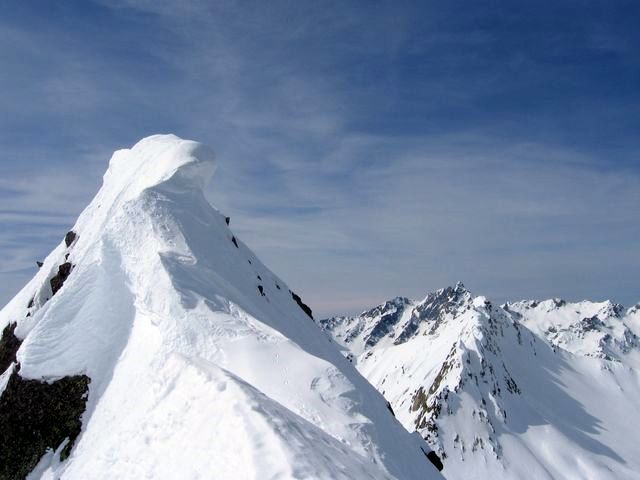 Jusqu'au 2/3 de la face c'est bien transfo, plus haut pas vraiment. Plutôt une croute de regel qui revient sur de la semoule. Croute encore portante à la descente. Sortie plaquée juste sous l'arête (2 ou 3 m de long), plaque de neige froide sur semoule.