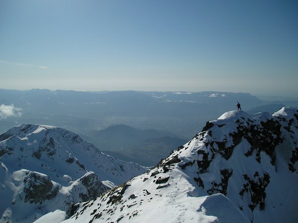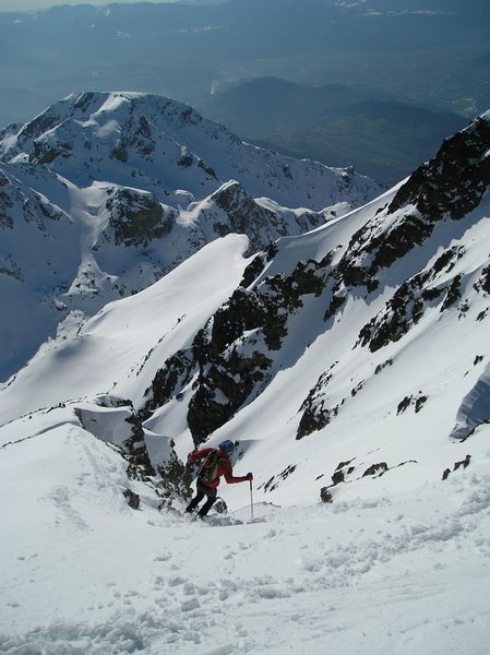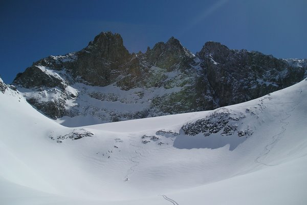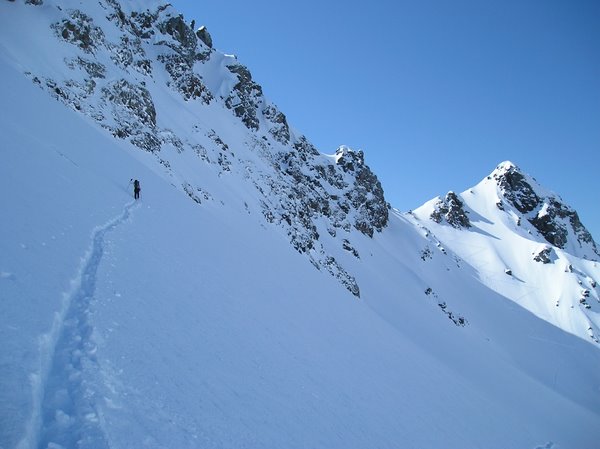 L'objectif premier était le Couttet voire le Doménon dans leurs versants ombragés. Le premier étant surpeuplé et le second mal enneigé, on a improvisé ce tour. Ambiance toujours fantastique sous les trois pics de Belledonne.