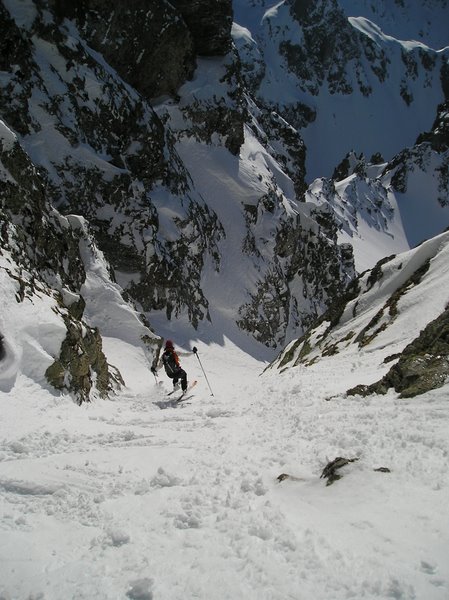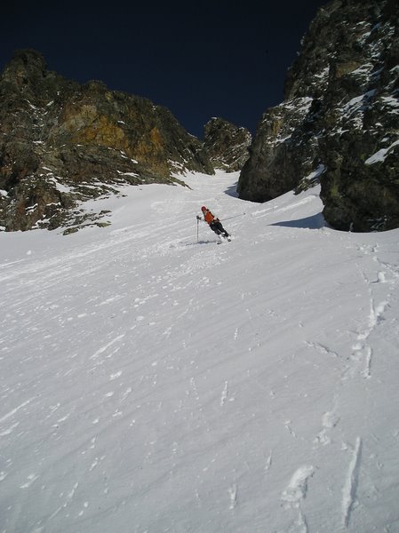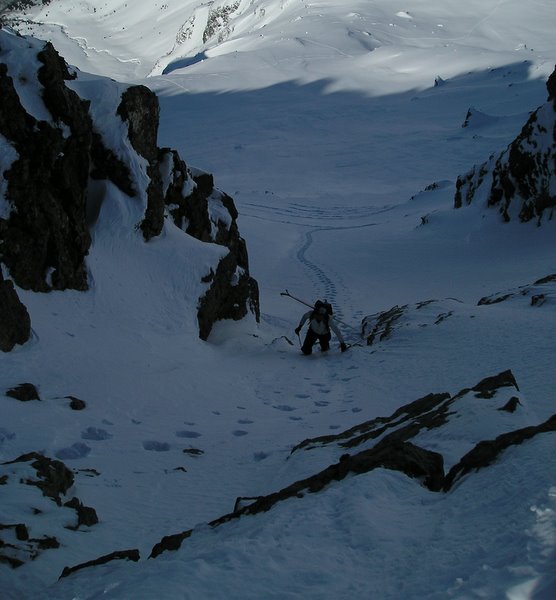 Montée aux Rochers Rouges par B10 : descente de la branche de droite (sens descente) jusqu'au lac Blanc. De là remontée au col du lac Blanc puis à la Grande Lance. Descente sur 100m versant sud puis remontée au point 2692. Descente sur 100 m à nouveau puis traversée mixte sur le pic du Loup. Descente sud en se tenant rive D. Puis 200m sous le sommet on a bifurqué à droite dans un petit couloir qui descend sur le lac du Loup.