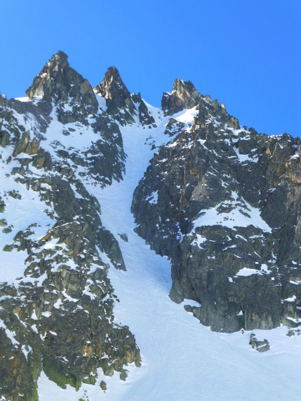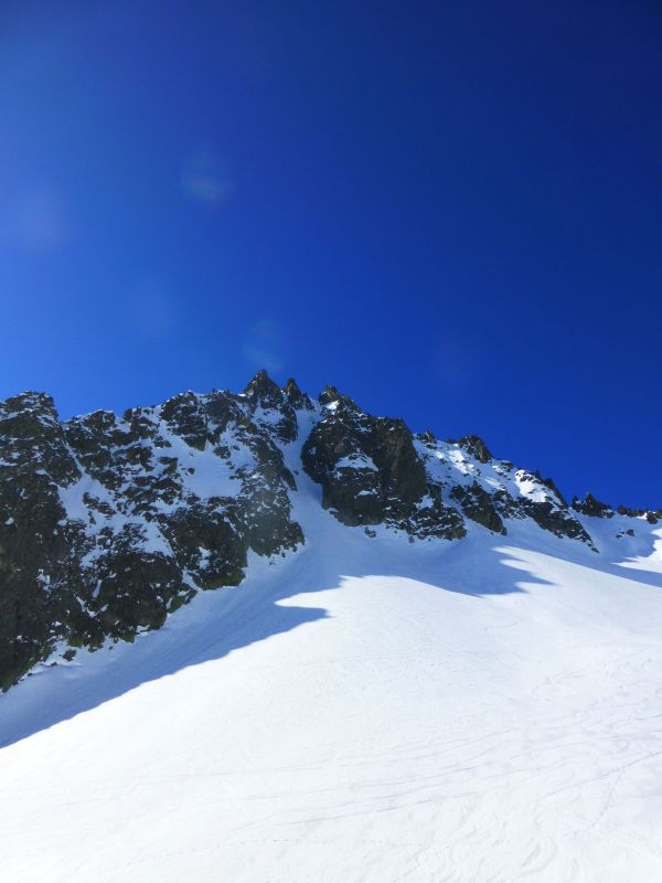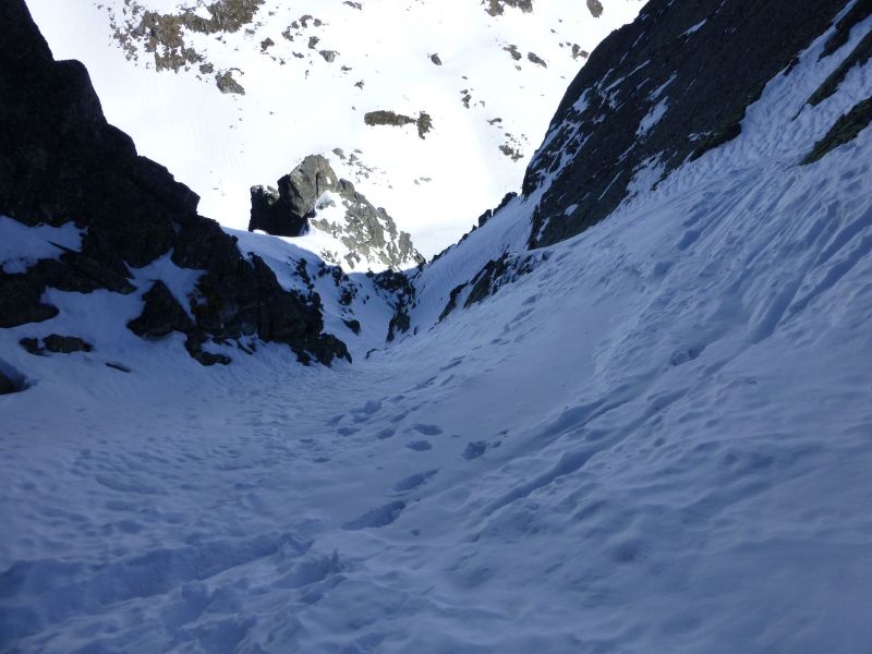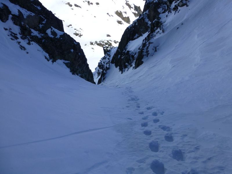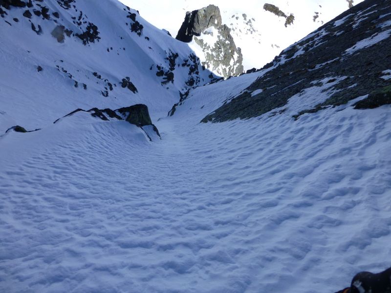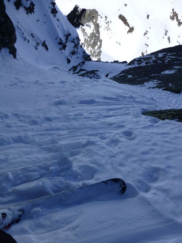 Le remplissage est bon. Globalement la neige est plutôt meuble dans le couloir avec parfois de courtes parties en neige plus compacte où le grip reste toujours excellent.