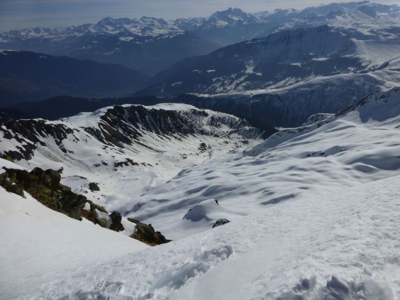 Je suis descendu par la rive droite de la combe de Bridan, mieux enneigée, moyennant 2 courts déchaussages. Ca passe encore bien.