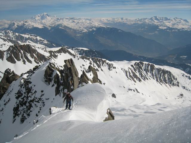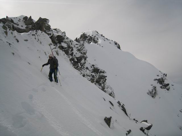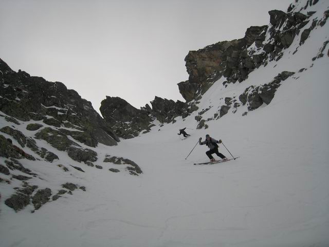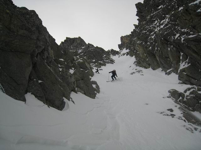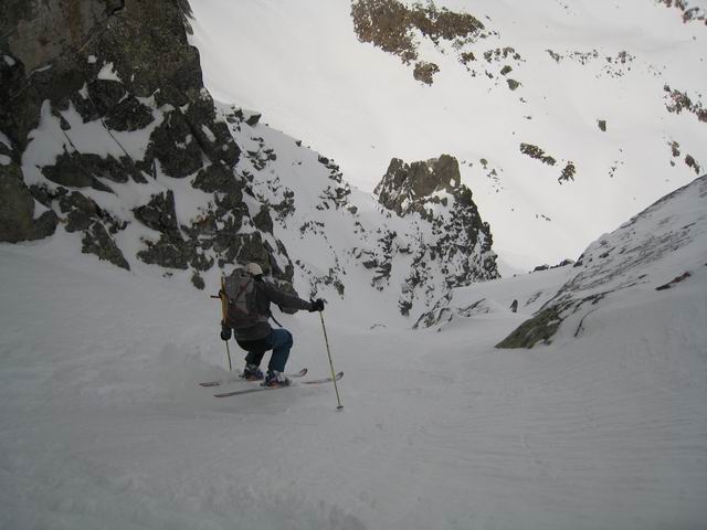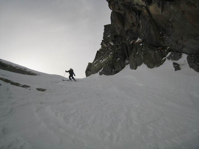 Il ne manque pas grand pour skier les 10 derniers mêtres du sommet du Rognolet, dommage. Le bout de descente qui suit pour attraper dle couloir nord est vraiment court. Mais c'est quand même plus plaisant que de remonter le couloir comme l'ont fait les 1+2 skieurs rencontrés ce jour, alors qu'on descendait. Les 2 derniers s'en s'ont pris plein la tête jusqu'à ce qu'on les voit arriver et qu'on s'arrête le temps de les laisser passer. Du bon ski dans l'ensemble, dans le bas, la croûte de regel du matin avait fait place à une bonne poudre transformée.