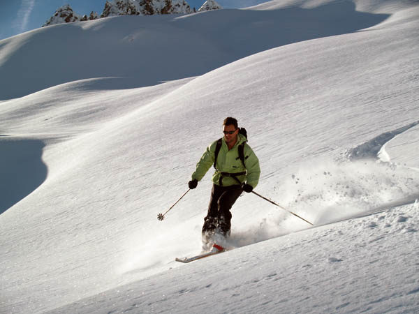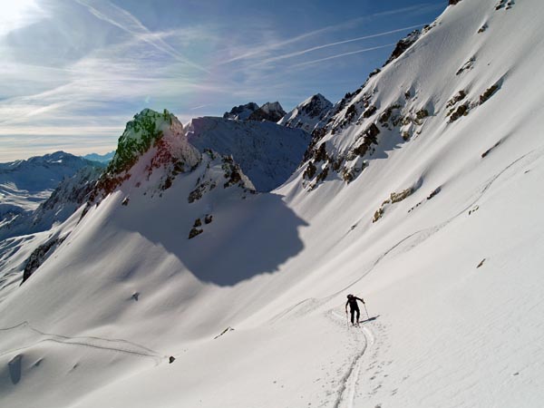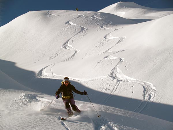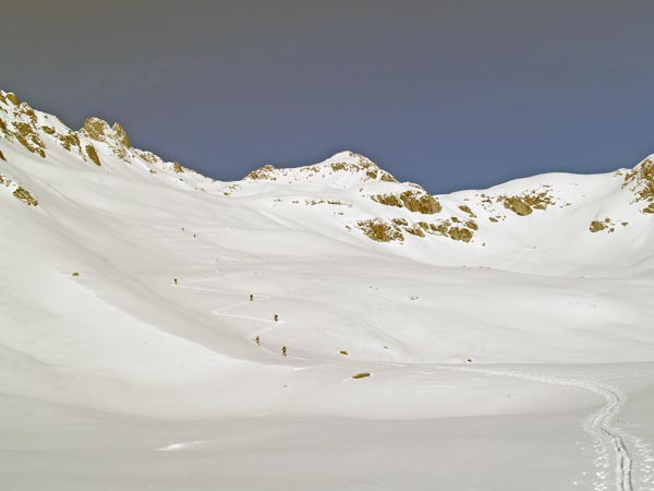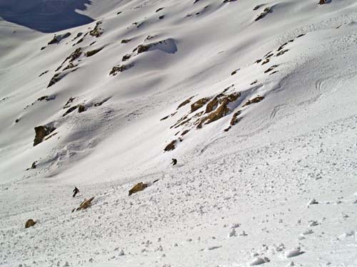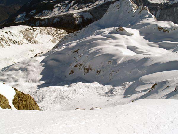 cela monte et cela descend sans trop de souci, mais non sans crainte. Les cailloux ne sont pas bien loin. Neige très variable : poudreuse à l'ombre, humidifiée (genre mois de mars) dans les versants voyant le soleil, neige soufflée, croûte dure. Un peu de tout, mais bien skiable. Grosse activité avalanche dans le versant est côté Bridan... Joli départ en plaque, avec une extension assez remarquable au vu du terrain. A peu près toutes les ruptures de pente ont donné lieu à des coulées.