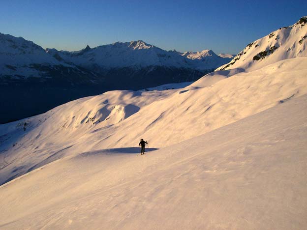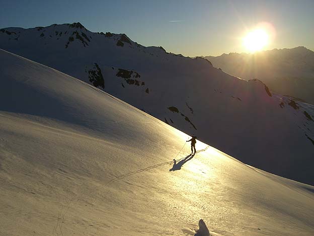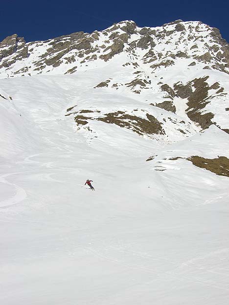 Très beau couloir qui sort au sommet même du point culminant du Beaufortain. Assez soutenu dans le haut mais pas extrême : seuls les 100 derniers mètres sont à 50° de moyenne avec un petit bombé légèrement plus raide. En-dessous, c'est "sans histoire" et à 45° maxi. Une fois au bas du couloir, on a avalé le reste de la descente en une dizaine de minutes. Merci à ODL pour les infos sur l'accès.