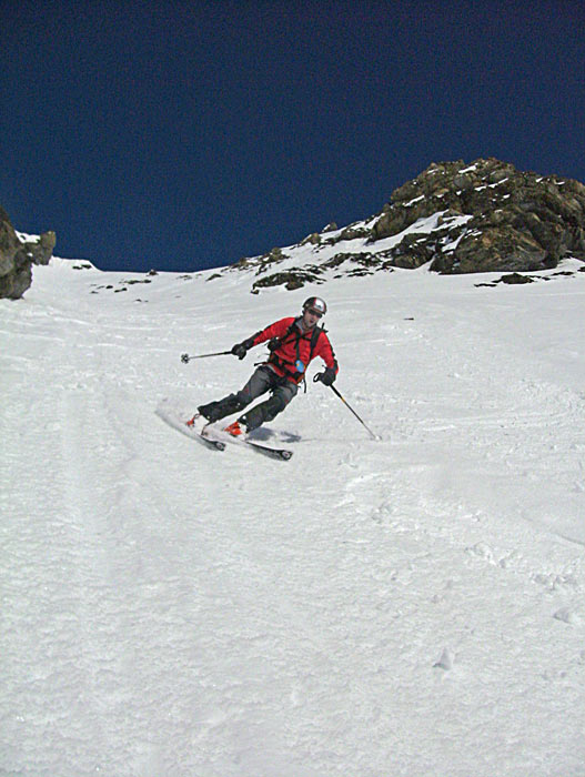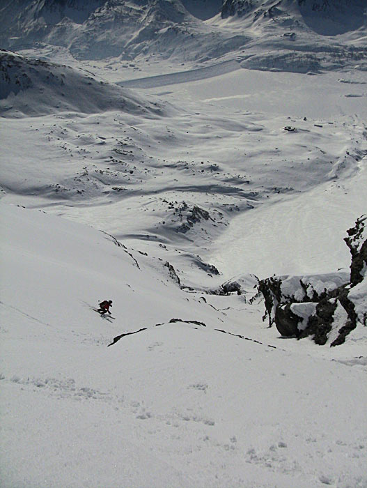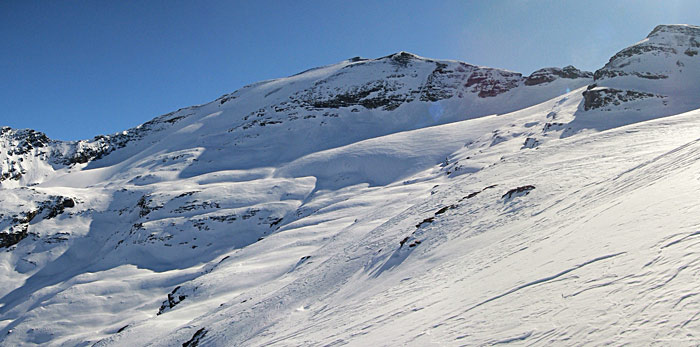 Bon remplissage de la face qui est restée lisse, sauf sous 2800m où deux trois petites coulées de la veille parties des rochers ont mis un peu de relief.