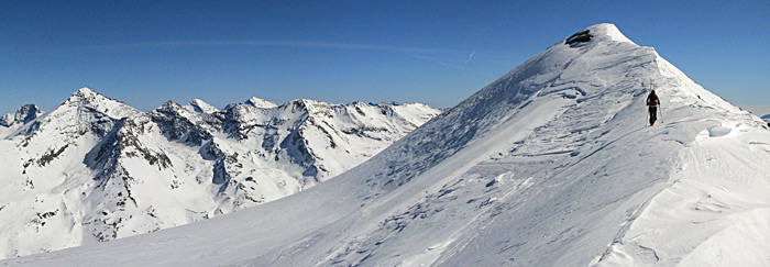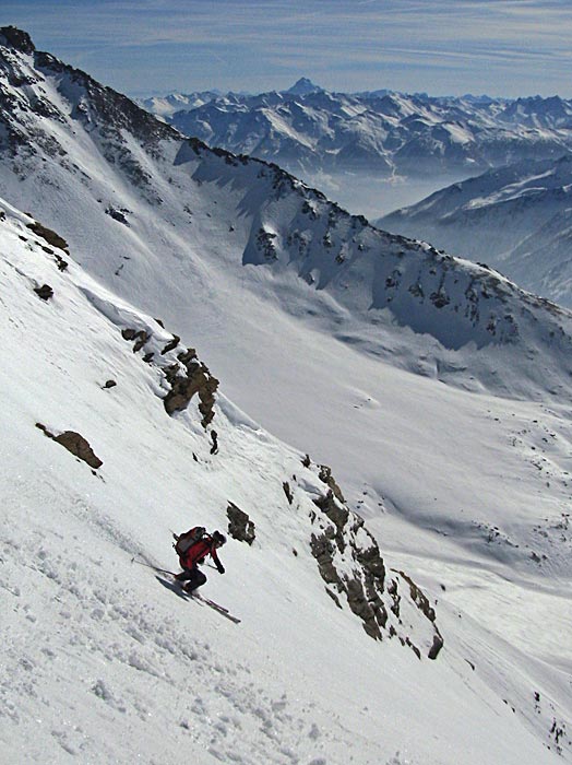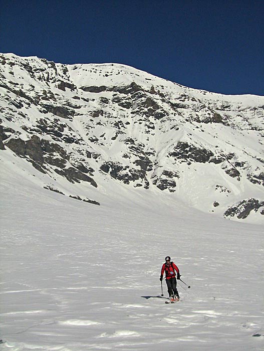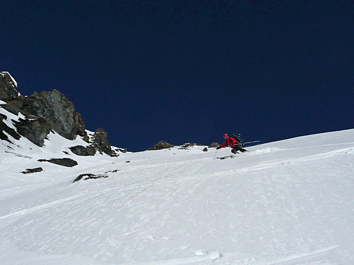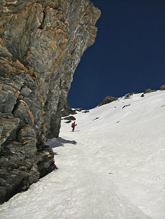 les 50 m sommitaux exposés au vent ne sont pas bien enneigés (traversée vers le couloir issu du pt 3584)