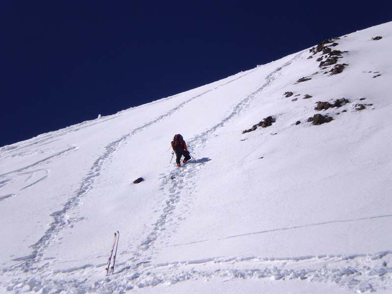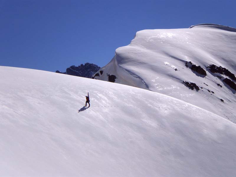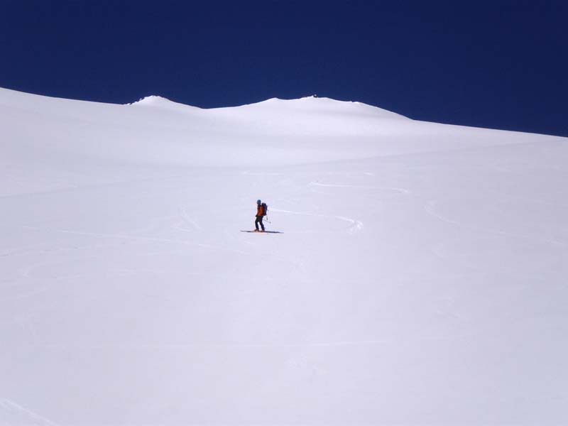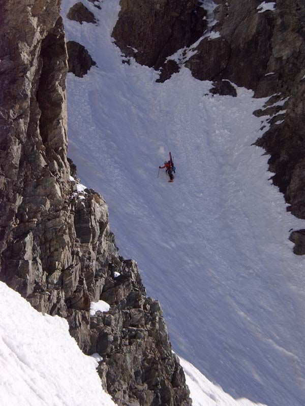 Avec l'excellent regel de la nuit, on n'a rien vu ni entendu bouger. Il ne faut pas descendre trop tard la pente à gauche (en montant) du couloir, car la neige y est lourde et la pente assez raide.