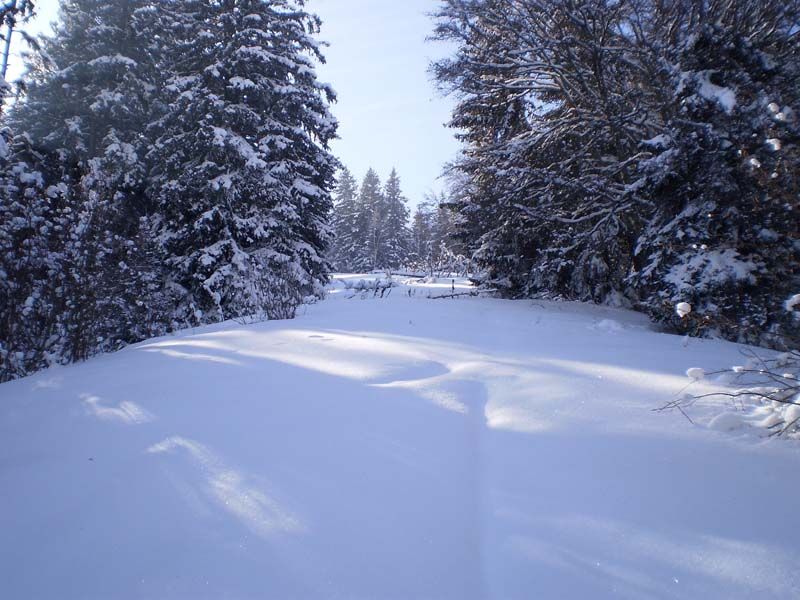 Itinéraire évident. La trouée est assez étroite et on est parfois un peu gêné par des branches basses chargées de neige.